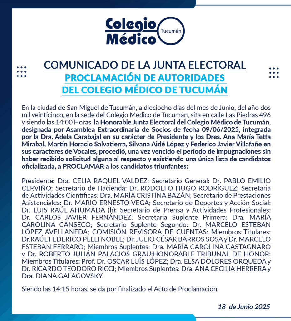 En la ciudad de San Miguel de Tucumán, a dieciocho días del mes de Junio, del año dos mil veinticinco, en la sede del Colegio Médico de Tucumán, sita en calle Las Piedras 496 y siendo las 14:00 Horas, la Honorable Junta Electoral del Colegio Médico de Tucumán, designada por Asamblea Extraordinaria de Socios de fecha 09/06/2025, integrada por la Dra. Adela Carabajal en su carácter de Presidente y los Dres. Ana María Tetta Mirabal, Martín Horacio Salvatierra, Silvana Aidé López y Federico Javier Villafañe en sus caracteres de Vocales, procedió, una vez vencido el período de impugnaciones sin haber recibido solicitud alguna al respecto y existiendo una única lista de candidatos oficializada, a PROCLAMAR a los candidatos triunfantes: Presidente: Dra. CELIA RAQUEL VALDEZ; Secretario General: Dr. PABLO EMILIO CERVIÑO; Secretario de Hacienda: Dr. RODOLFO HUGO RODRÍGUEZ; Secretaria de Actividades Científicas: Dra. MARÍA CRISTINA BAZÁN; Secretario de Prestaciones Asistenciales: Dr. MARIO ERNESTO VEGA; Secretario de Deportes y Acción Social: Dr. LUIS RAÚL AHUMADA (h); Secretario de Prensa y Actividades Profesionales: Dr. CARLOS JAVIER FERNÁNDEZ; Secretaria Suplente Primera: Dra. MARÍA CAROLINA CANSECO; Secretario Suplente Segundo: Dr. MARCELO ESTEBAN LÓPEZ AVELLANEDA; COMISIÓN REVISORA DE CUENTAS: Miembros Titulares: Dr.RAÚL FEDERICO PELLI NOBLE; Dr. JULIO CÉSAR BARROS SOSA y Dr. MARCELO ESTEBAN FERRARO; Miembros Suplentes: Dra. MARÍA CAROLINA CASTAGNARO y Dr. ROBERTO JULIÁN PALACIOS GRAU;HONORABLE TRIBUNAL DE HONOR: Miembros Titulares: Prof. Dr. OSCAR LUÍS LÓPEZ; Dra. ELSA DOLORES ORQUEDA y Dr. RICARDO TEODORO RICCI; Miembros Suplentes: Dra. ANA CECILIA HERRERA y Dra. DIANA GALAGOVSKY. Siendo las 14:15 horas, se da por finalizado el Acto de Proclamación.